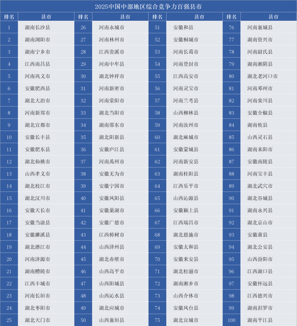 报告显示,2025中国中部百强县市在6个省份均有分布,其中安徽(23个)、湖北(22个)、河南(21个)数量位居前三。大量上榜县市分布在省会城市和区域性中心城市周边,承接其产业外溢和功能疏解。