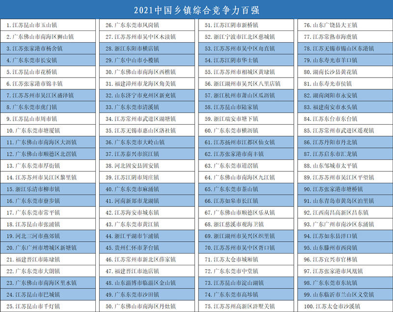 9月6日,竞争力智库、中国发展改革报社和北京中新城市规划设计研究院等机构在北京联合发布《2021乡镇综合竞争力报告》(以下简称《报告》)。《报告》同时揭晓了2021中国百强镇、2021中部百强镇、2021西部百强镇名单。