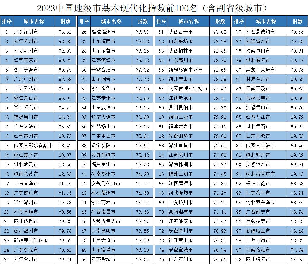 12月19日,竞争力智库、北京中新城市规划设计研究院等机构在北京联合发布了《中国城市基本现代化监测报告2023》(以下简称《报告》),揭晓了“2023中国地级市基本现代化指数前100名(含副省级城市,下同)”“2023中国县级市基本现代化指数前100名”。