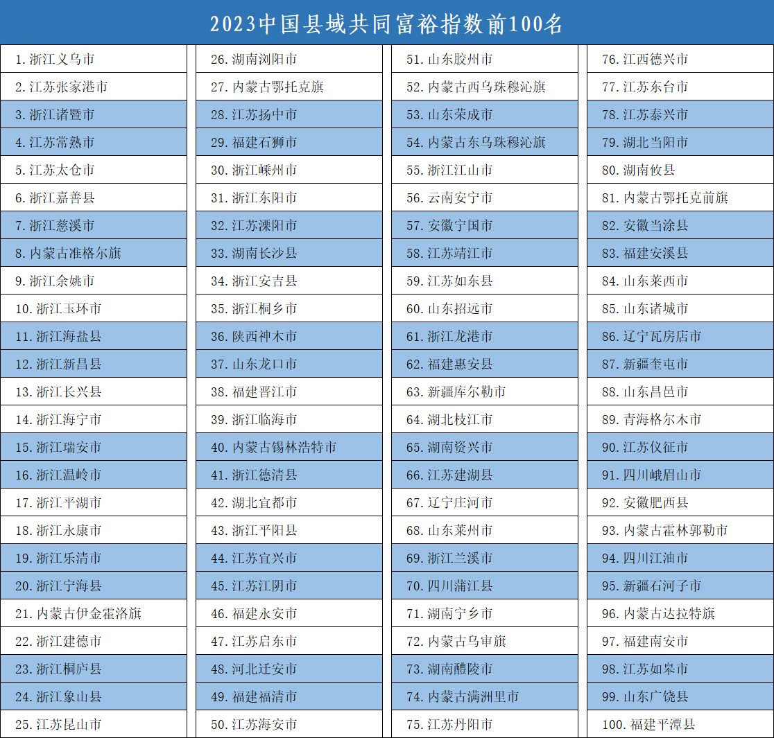 比百强县更“富” 首届中国县域共同富裕指数前100名发布