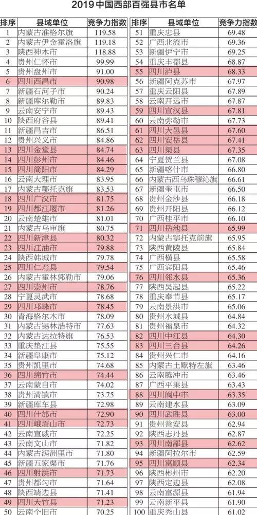 其中,在“2019中国西部百强县市”名单中,四川入围29县市,位居西部首位。“西部大开发20年县域高质量发展20个典型案例”中,四川有3县市入围。