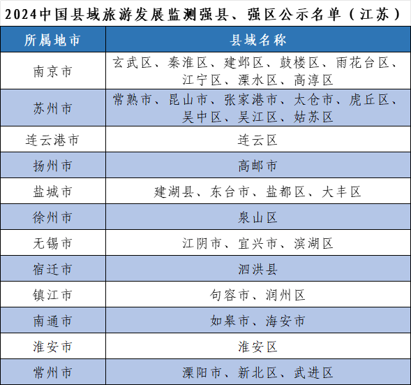 截至2023年底,江苏省有县级行政单位(含市辖区)96个。其中,55个市辖区、22个县级市、19个县。江苏省纳入2024(第七届)中国县域旅游发展监测的强县共14 个、强区21个,占江苏省县级单位总数的36%;公示如下:
