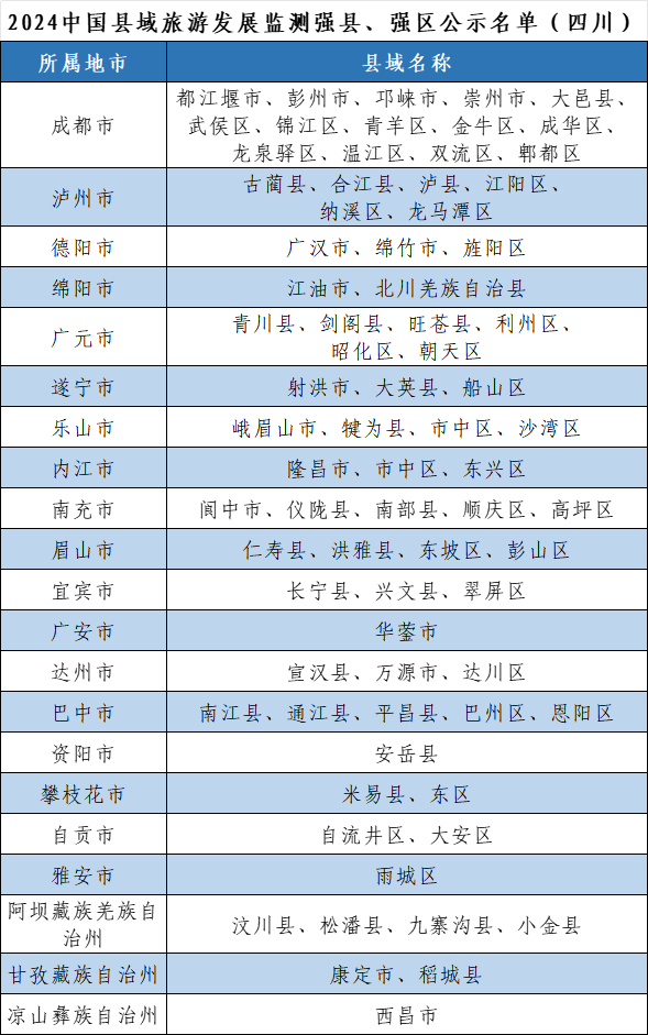 截至2023年底,四川省有县级行政单位(含市辖区)183个。其中,市辖区55个、县级市19个、县105个、自治县4个。四川省纳入2024(第七届)中国县域旅游发展监测的强县共75个,占四川省县级单位总数的41%。具体名单公示如下: