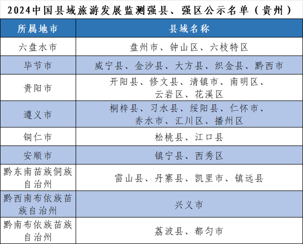 截至2023年底,贵州有县级行政单位(含市辖区)88个。其中,县级市9个、县52个、市辖区15个、自治县11个、特区1个。贵州省纳入2024(第七届)中国县域旅游发展监测的强县共24个、强区8个,占贵州省县级单位总数的36%;公示如下: