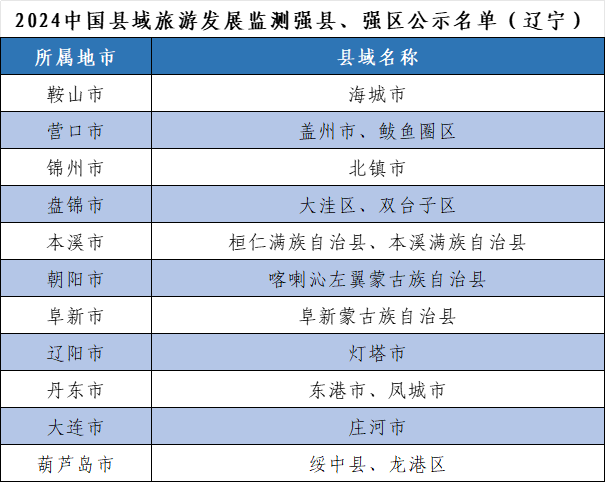 截至2023年底,辽宁省有县级行政单位(含市辖区)100个。其中,市辖区59个、县级市16个、县17个、自治县8个。辽宁省纳入2024(第七届)中国县域旅游发展监测的强县共12个、强区4个,占全省县级行政单位总数的16%。公示如下:
