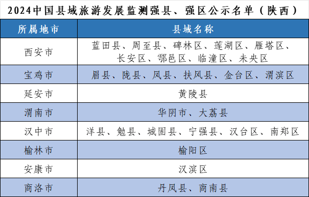 截至2023年底,陕西省有县级行政单位(含市辖区)107个。其中,县级市7个、县69个、市辖区31个。陕西省纳入2024(第七届)中国县域旅游发展监测的强县共15个、强区13个,占陕西省县级单位总数的26%;公示如下: